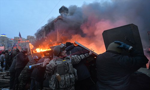 An anti-government protester uses a slingshot during clashes with the police on Independence Square in Kiev early on Wednesday. Protesters, many of them masked and in battle fatigues, braced on Wednesday for a fresh assault by riot police in central Kiev after a day of clashes. Photo: AFP