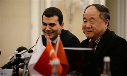 Chinese writer and Nobel laureate Mo Yan (R) speaks at a press confrence in Istanbul, Turkey, on February 22. Mo Yan, who is taking a week-long tour to Turkey, called on the Chinese and Turkish governments Saturday to make further efforts in translating more works in a bid to increase better understanding and friendship between the people of the two countries. Photo:Xinhua