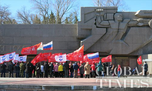 In Sevastopol, the Black Sea coastal city where the Russian fleet is based, enthusiastic members of pro-Russian party Soyuz Party chant slogans while Russian flags flutter in the wind on Nahimov Square on March 17. Photo: Li Qian/GT