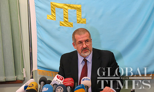 Chubarov Refat, Chairman of the Krimean Tatar Meglis, a Tatar community organization in Crimea, spoke to the media on March 17 in Simferopol, Crimea to explain the stance of the Tatar comunity on the Crimean referendum. Photo: Li Qian/GT