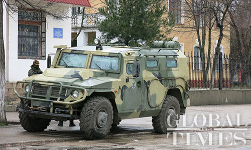 Russian soldiers and a military vehicle are stationed outside a Ukrainian infantry facility in Simferopol on March 16. Photo: Li Qian/GT (More Photos)