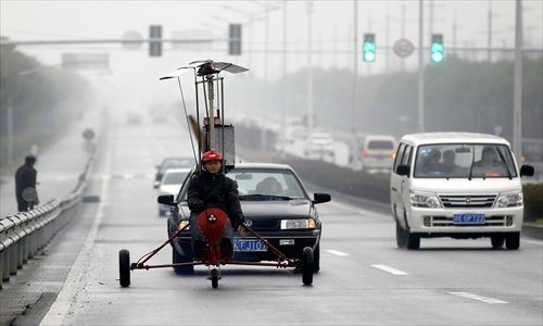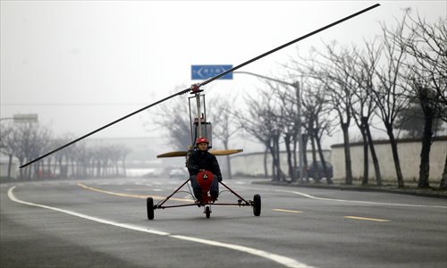 Luo Jinshan gives his gyroplane a test run but stays on the road. Photo: Yang Hui/GT
