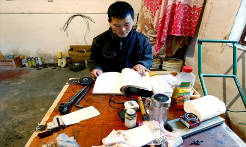 Luo looks over notes in his makeshift gyroplane workshop. Photo: Yang Hui/GT