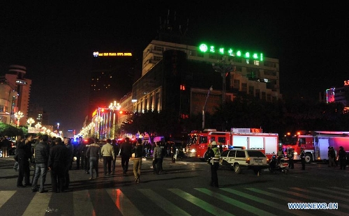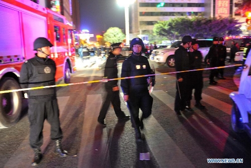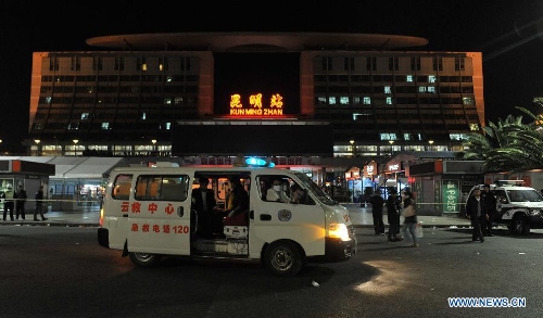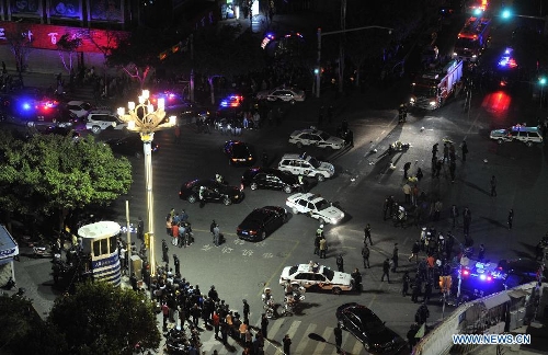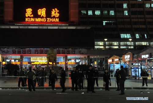 Photo taken on March 1, 2014 shows the surrounding of Kunming Railway Station in Kunming, capital of southwest China's Yunnan Province. A group of unidentified armed men on Saturday stormed into Kunming Railway Station, causing injuries, said the city police. (Xinhua/Lin Yiguang)