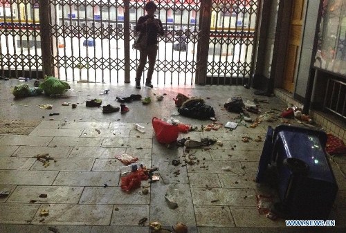 Picture taken on March 1, 2014 shows luggages scattered inside the Kunming Railway Station in Kunming, capital of southwest China's Yunnan Province. Twenty-seven people were confirmed dead and 109 others injured Saturday in a railway station violent attack in southwest Chinese city of Kunming, authorities said. (Xinhua/Lin Yiguang)