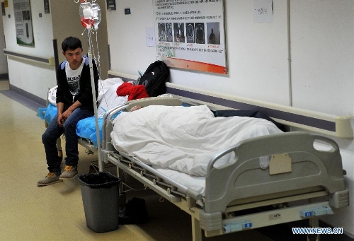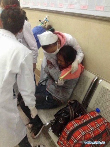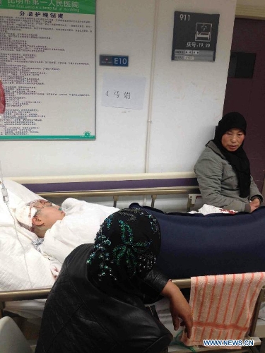 Injured people from the Kunming terrorist attack receive treatment at the First People's Hosptial of Kunming in Kunming, capital of southwest China's Yunnan Province, March 2, 2014. More than 10 terrorist suspects attacked people at the square and ticket hall of Kunming Railway Station at 9:20 p.m. on Saturday, killing at least 28 civilians and injuring 113 others. Police shot dead five attackers and are hunting for the rest. (Xinhua/Lin Yiguang)