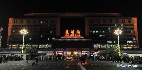 Photo taken on March 1, 2014 shows the exterior of Kunming Railway Station in Kunming, capital of southwest China's Yunnan Province. A group of unidentified armed men on Saturday stormed into Kunming Railway Station, causing injuries, said the city police. (Xinhua/Lin Yiguang)
