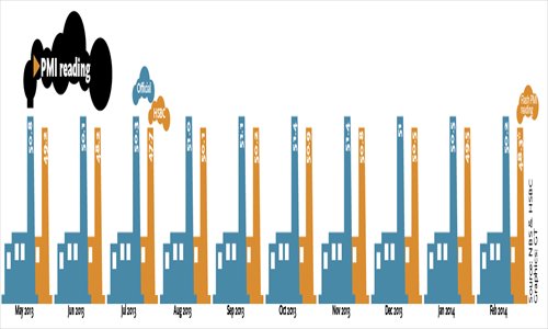 The HSBC PMI was even more influenced by the Chinese Lunar New Year holidays, so seasonal factors should also be seen as the main reason for its drop in February, Lu Ting, chief China economist with Bank of America Merrill Lynch, said in a note sent to the Global Times over the weekend.