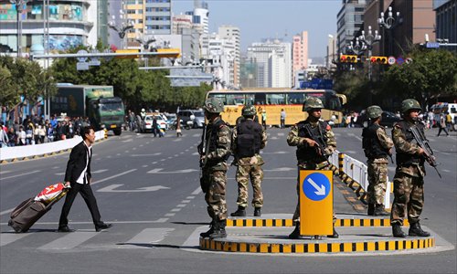 Armed police stand guard at Kunming Railway Station on Sunday. The station has returned to normal operations. Photo: IC