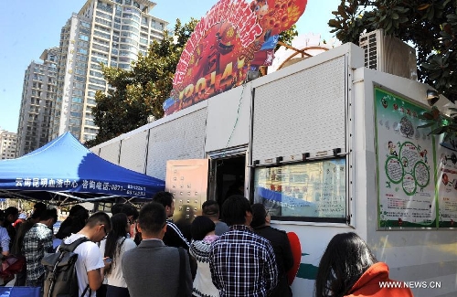 Citizens wait to donate blood at a mobile blood collection station in Kunming, capital of southwest China's Yunnan Province, March 2, 2014. Twenty-nine people died and more than 130 were injured in the Kunming Railway Station terrorist attack as of 8 a.m. on Sunday. As more and more citizens volunteered to donate blood for the injured people of terrorist attack, the local blood center set up 12 collection stations and prolonged opening hours. (Xinhua/Chen Haining)