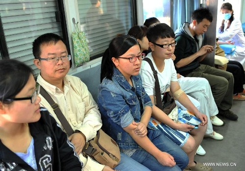Volunteers wait to donate blood at a mobile blood collection station in Kunming, capital of southwest China's Yunnan Province, March 2, 2014. Twenty-nine people died and more than 130 were injured in the Kunming Railway Station terrorist attack as of 8 a.m. on Sunday. As more and more citizens volunteered to donate blood for the injured people of terrorist attack, the local blood center set up 12 collection stations and prolonged opening hours. (Xinhua/Chen Haining)