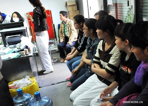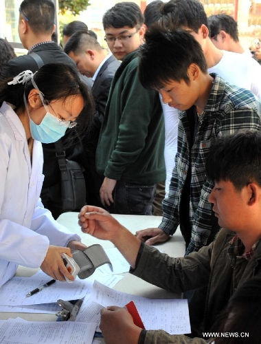 Volunteers have blood pressure measured before donating blood at a mobile blood collection station in Kunming, capital of southwest China's Yunnan Province, March 2, 2014. Twenty-nine people died and more than 130 were injured in the Kunming Railway Station terrorist attack as of 8 a.m. on Sunday. As more and more citizens volunteered to donate blood for the injured people of terrorist attack, the local blood center set up 12 collection stations and prolonged opening hours. (Xinhua/Chen Haining)