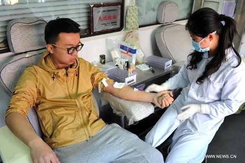 An undergraduate who studies in Kunming donates blood at a mobile blood collection station in Kunming, capital of southwest China's Yunnan Province, March 2, 2014. Twenty-nine people died and more than 130 were injured in the Kunming Railway Station terrorist attack as of 8 a.m. on Sunday. As more and more citizens volunteered to donate blood for the injured people of terrorist attack, the local blood center set up 12 collection stations and prolonged opening hours. (Xinhua/Chen Haining)