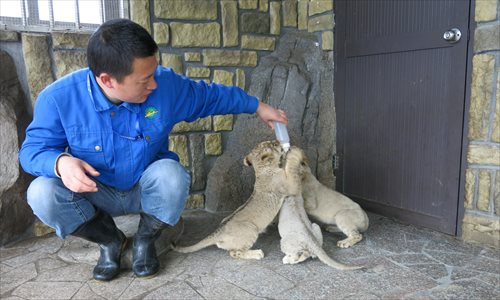 Shanghai Wild Animal Park keeper Li Shiqiang feeds three lion cubs. Photo: Du Qiongfang/GT