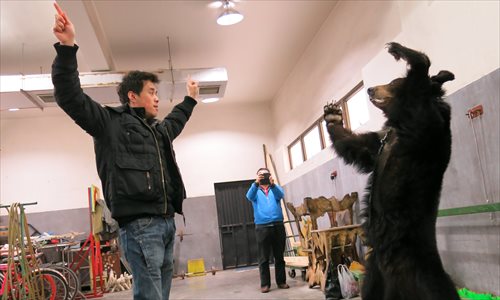 Trainer Wang Yun helps a black bear learn to dance at the Shanghai Circus World. Photo: Du Qiongfang/GT