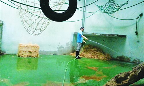 A keeper at the Shanghai Zoo cleans out the cage where the popular gorilla Happy lives and plays. Photo: Du Qiongfang/GT
