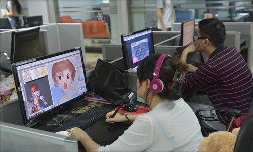 Staff members of a technology company in an Internet industry park in Southwest China's Chongqing work on developing games software. Photo: IC