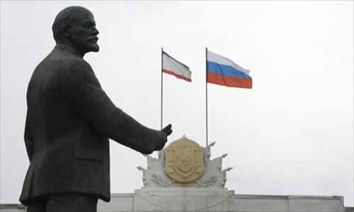 Russian (right) and Crimean flags flutter on top of the Crimean government building near a statue of Vladimir Lenin in Simferopol, Ukraine on Tuesday. Photo: AFP