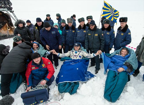 US astronaut Michael Hopkins join hands with Russian cosmonauts, Oleg Kotov and Sergey Ryazansky (right to left), shortly after their landing of Soyuz TMA-10M capsule in the Kazakh steppe town of Zhezkazgan on Tuesday. They landed safely after a stay of over five months aboard the International Space Station. Photo: AFP