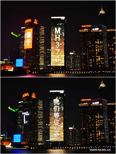 Combination photo taken on March 11, 2014 shows "MH370, We Are Waiting for You Back Home" displayed on a skyscraper at the Lujiazui Financial District in Shanghai, East China. The flight MH370, a Boeing 777-200 aircraft, left Kuala Lumpur International Airport at 0:41 a.m. Beijing time (1641GMT on March 7) on March 8 and was expected to land in Beijing at 6:30 am (0030GMT March 8) that day. Contact with the flight was lost along with its radar signal at 2:40 am Beijing time (1840GMT on March 7) on March 8 when it was flying over the Ho Chi Minh air traffic control area in Vietnam. The flight was carrying 12 crew members and 227 passengers, including 154 Chinese. (Xinhua/Shen Chunchen)