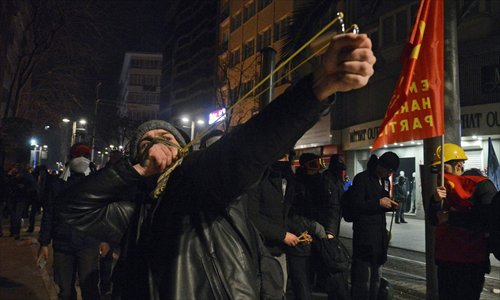 A protester aims a slingshot at riot police forces during a demonstration in Istanbul, Turkey, Tuesday. The death of Berkin Elvan triggered renewed clashes between activists and police. The Elvan family has blamed Prime Minister Recep Tayyip Erdogan for their son's death. Photo: CFP