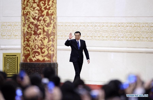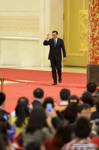 Chinese Premier Li Keqiang greets journalists upon arriving at his press conference after the closing meeting of the second annual session of China's 12th National People's Congress (NPC) at the Great Hall of the People in Beijing, capital of China, March 13, 2014. (Xinhua/Wang Ye)