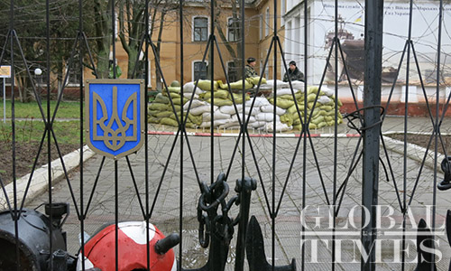 Ukrainian soldiers guard a military facility on Marx Street in central Simferopol during the Crimean referendum on March 16. Photo: Li Qian/GT