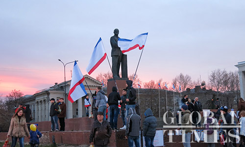 People wave Crimean flags at Lenin Square in central Simferopol during the Crimean referendum on March 16. Photo:Li Qian/GT
