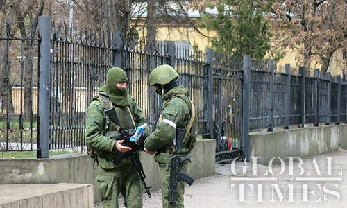 Russian soldiers stand watch outside a Ukrainian infantry facility in Simferopol, Crimea during the Crimea referendum on March 16. Photo: Li Qian/GT