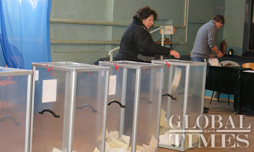 A woman casts her ballot at a school in Gvardeyskoye, Ukraine’s most populated township about 20 kilometers north of Simferopol, during the Crimean referendum on March 16. Photo: Li Qian/GT
