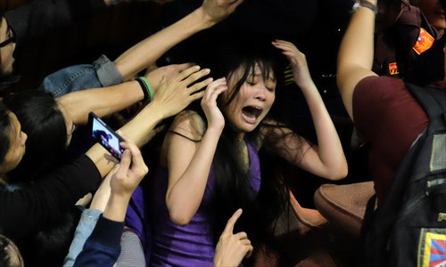 A protester shouts as police officers try to remove chairs displayed to block the entrance of the assembly hall of Taiwan's legislative body on Tuesday. Over 1,000 students and members of the public rallied outside the compound, protesting against moves by the Taiwan authorities to cut short the review of the cross-Strait service trade agreement. Photo: AFP
