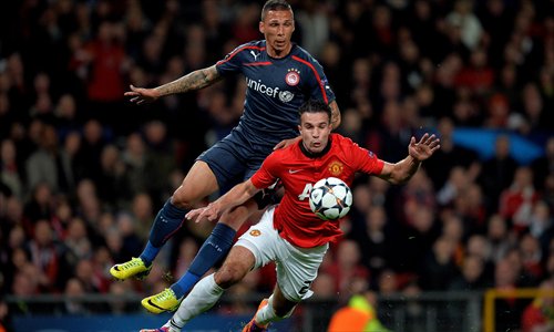 Robin van Persie (front) of Manchester United is fouled by Olympiakos player Jose Holebas during their European Champions League match in Manchester on Wednesday (British time). United won 3-0. Photo: CFP