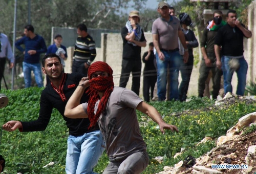 Palestinian protestors throw stones at Israeli soldiers during a protest against the expanding of Jewish settlements in Kufr Qadoom village near the West Bank city of Nablus on March. 21, 2014. (Xinhua/Nidal Eshtayeh)