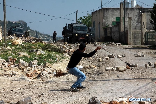 A Palestinian protester throws stones at Israeli soldiers during a protest against the expanding of Jewish settlements in Kufr Qadoom village near the West Bank city of Nablus on March. 21, 2014. (Xinhua/Nidal Eshtayeh)