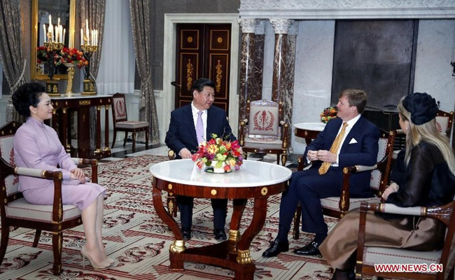Chinese President Xi Jinping (2nd L) meets with Dutch King Willem-Alexander (2nd R) in Amsterdam, the Netherlands, March 22, 2014. Photo: Xinhua