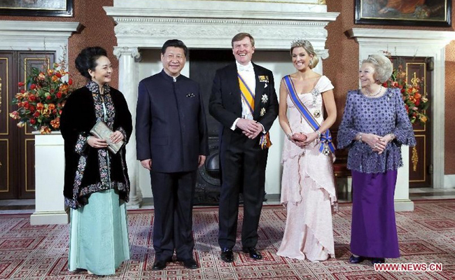 Chinese President Xi Jinping (2nd L), his wife Peng Liyuan (L), Dutch King Willem-Alexander (C), Queen Maxima (2nd R) and former Queen Beatrix (R) pose for photos in Amsterdam, the Netherlands, March 22, 2014. Photo: Xinhua