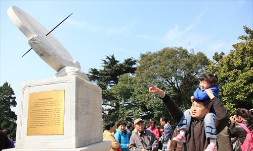 A man explains the Chinese ancient timing instrument, rigui or sundial, at a meteorological museum in Nanjing, Jiangsu Province on Sunday. World Meteorological Day is celebrated every year on March 23. This year's theme is "Weather and climate: engaging youth." Photo: IC