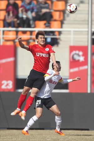 Yang Shanping (left) of Liaoning Whowin competes with Guizhou Renhe's Yu Hai during their Chinese Super League match in Panjin, Northeast China's Liaoning Province on Sunday. Guizhou won 2-1. Photo: CFP