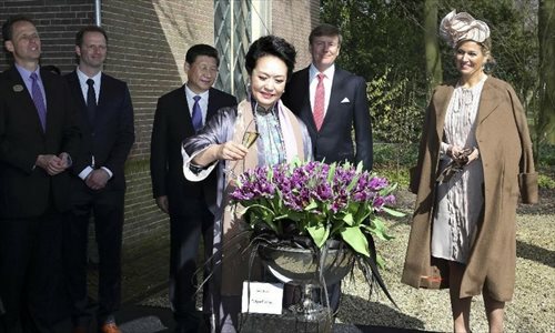 Chinese President Xi Jinping (back, 3rd L) and his wife Peng Liyuan (front) visit a tulip exhibition, accompanied by Dutch King Willem-Alexander (back, 2nd R) and Queen Maxima (back, 1st R) , at Keukenhof in Lisse, the Netherlands, March 23, 2014. Peng was invited to christen a new strain of tulip the "Cathay" here on Sunday. Photo: Xinhua