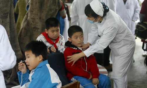 Medical workers attend to pupils from Baiyun Primary School at a hospital in Liuzhou, Guangxi Zhuang Autonomous Region, after more than 20 students suffered from a gas leak from a shop near the school on Monday morning. Photo: CFP