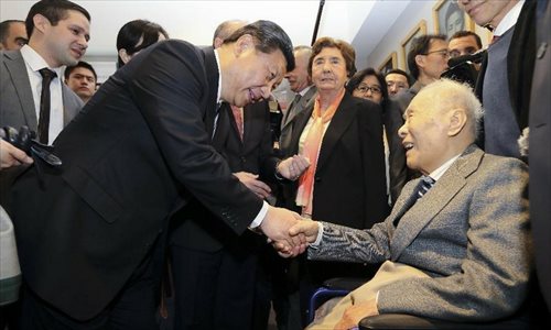 Chinese President Xi Jinping (L, front) shakes hands with 99-year-old Chinese-French translator Li Zhihua while Xi visited the former site of the Lyon Sino-French Institute in Lyon, France, March 26, 2014. Li Zhihua was once a student of the Lyon Sino-French Institute. He spent 27 years translating the Chinese classic novel "A Dream in Red Mansions" into French and became the first Chinese who ever introduced the novel to France. Photo: Xinhua