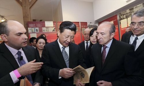Chinese President Xi Jinping (2nd L) visits the former site of the Lyon Sino-French Institute in Lyon, France, March 26, 2014. Photo: Xinhua