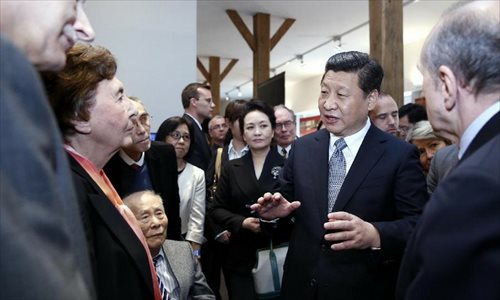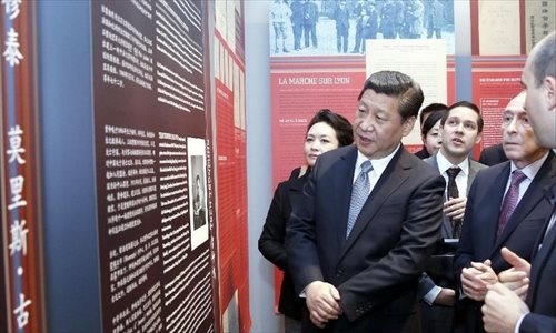 Chinese President Xi Jinping (2nd L, front) visits the former site of the Lyon Sino-French Institute in Lyon, France, March 26, 2014. Photo: Xinhua