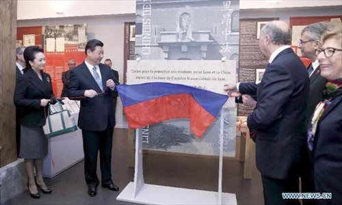 Chinese President Xi Jinping (2nd R, front) visits the former site of the Lyon Sino-French Institute in Lyon, France, March 26, 2014. Photo: Xinhua