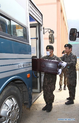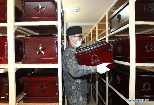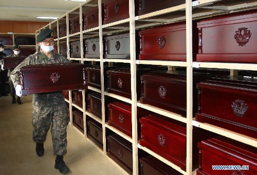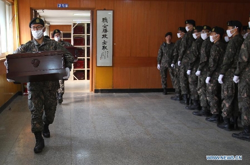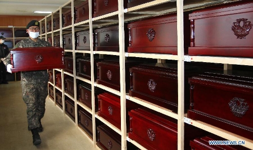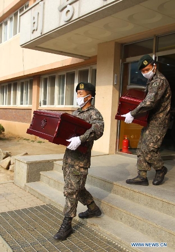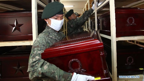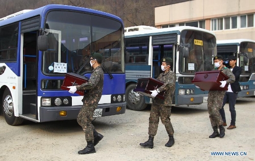 South Korean soldiers carry to the vehicle coffins containing remains of Chinese soldiers dead in the Korean War, in Paju, South Korea, March 27, 2014. The remains of 437 Chinese soldiers were transported from Paju to Incheon Airport on Thursday. They will be flown back to China after a handover ceremony at Incheon Airport on March 28. (Xinhua/Yao Qilin)