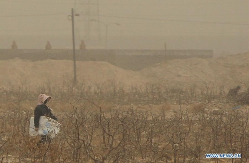 A woman works amid sand storm in Hami, northwest China's Xinjiang Uygur Autonomous Region, March 26, 2014. The city was hit by sand storm on March 26. (Xinhua/Polat)