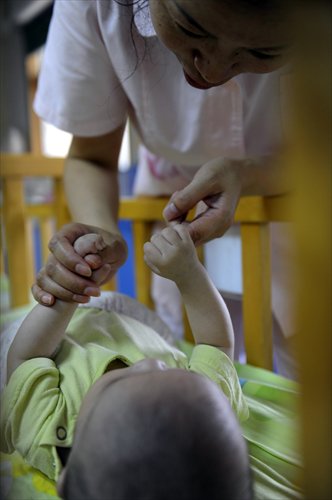 A worker cares an abandoned child at Nanjing Social Children's Welfare House in Jiangsu Province on May 29, 2013. Photo: CFP