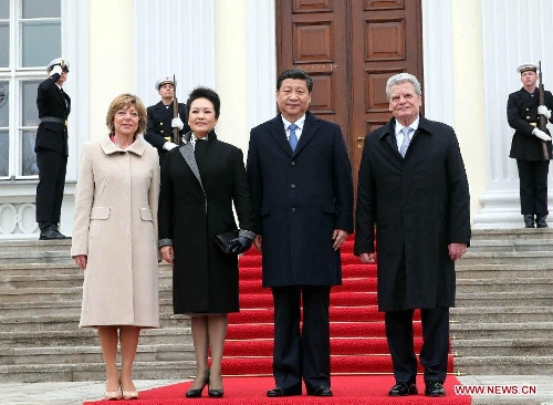 Chinese President Xi Jinping (R, front) attends a welcoming ceremony held by German President Joachim Gauck (L) before their meeting in Berlin, Germany, March 28, 2014. (Xinhua/Liu Weibing)