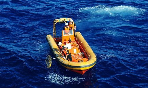 Staff members aboard a boat of Chinese Maritime Safety Administration patrol ship Haixun 01 search for the missing Malaysia Airlines flight MH370 in the southern Indian Ocean, March 29, 2014. Chinese patrol ship Haixun 01 on Saturday continued to search the area to relocate objects spotted earlier Friday by airborne searchers for the missing flight. Photo: Xinhua