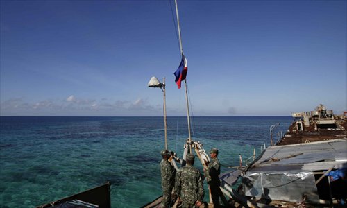 Philippine Marines raise the Philippine flag on the dilapidated navy ship LT57 BRP Sierra Madre at the disputed Ren'ai Reef in the South China Sea on Sunday. On Saturday, China Coast Guard attempted to block the Philippine government vessel AM700 carrying fresh troops and supplies, but the latter managed to dock beside the ship to replace troops who were deployed several months ago. Photo: AP